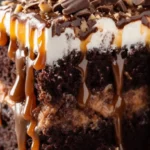 Upon removal from its cool sanctuary, spread the cool, airy Cool Whip over the cake with a gentle touch—this is the final layer of tranquility atop the rich chocolate foundation. To finish, sprinkle the chopped Heath bars over the surface, their crunchy shards glistening like jewels against the creamy backdrop.