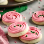 With your frosting poised, fill a piping bag fitted with a round tip, ready to adorn your cookies. Pipe the frosting onto the still-warm cookies, beginning in the center and spiraling outward, a beautiful swirl of art. Top immediately with glimmering Christmas sprinkles, each one a tiny gift of joy resting on the pink velvet.