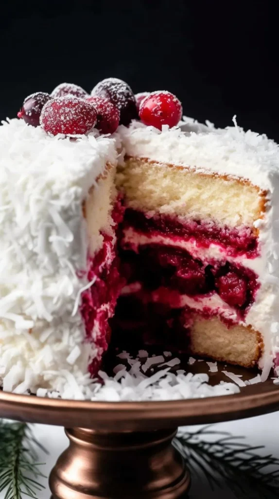 - Place the second layer on top, repeating the border and filling steps with the remaining cranberry filling. Finally, crown it with the last layer and be sure to frost the sides and top with the rest of the frosting. Press shredded coconut onto every surface, like a snowy hug, then finish garnishing with sugared cranberries and rosemary sprigs for that little touch of class.