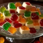 Now comes the moment when joyous color unveils itself—gently fold in the halved gumdrops, distributing their vibrant forms throughout the creamy base. With love, transfer this delightful mixture into the prepared pan, smoothing it with a spatula dusted lightly with powdered sugar. As a final touch, embrace the top with another whisper of powdered sugar, a delicate veil of sweetness, before placing it in the refrigerator to firm up for at least two hours.