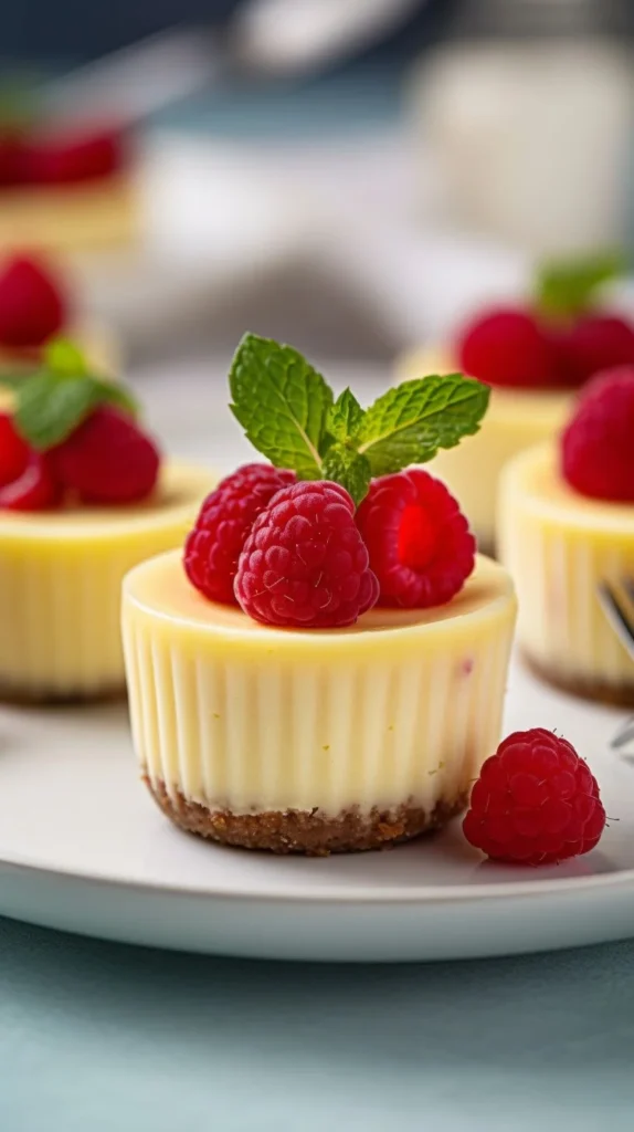 A bright whisper of lemon and a cool, velvety bite — these mini cheesecakes arrive like small, sunlit poems. Their crumbly bases give way to silken, citrus-scented centers, finished with a ribbon of glossy curd and a jewel of raspberry. Baking them is a patient ritual: subtle, precise, and quietly celebratory.