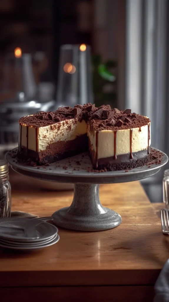 Pour this luscious cream over the biscuit base, smoothing the surface like a painter working their art, then return it to the cold for no less than four hours, although overnight is the ideal repose. When the time comes to serve, awaken your creation with a shower of cocoa powder and flecks of dark chocolate, bestowing it with an elegant finish that whispers of indulgence.