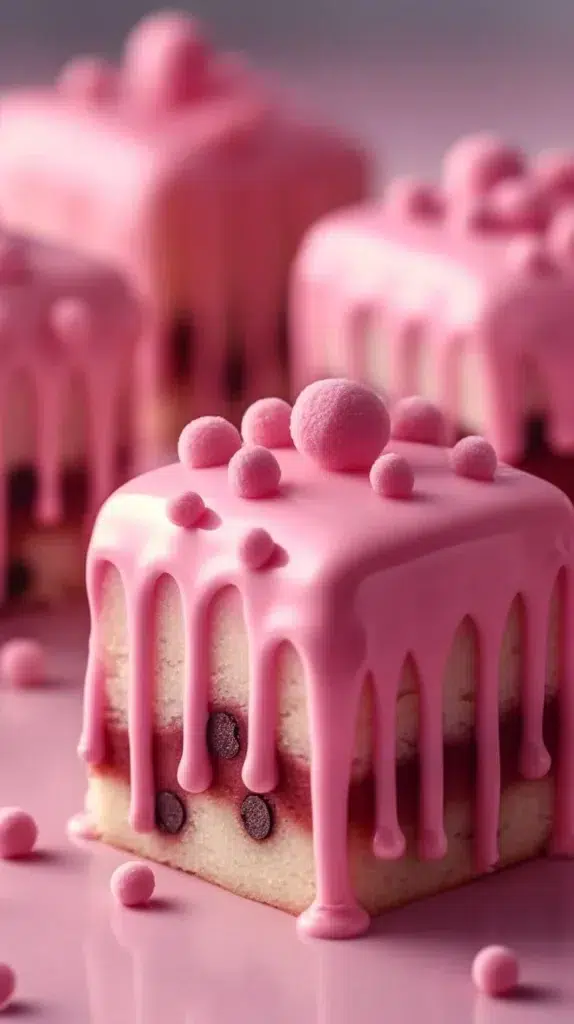 - Garnish: Before the glaze fully sets, scatter pink chocolate chips or candy hearts (Topping) so each mini cake wears a petal of confection.