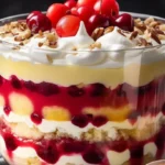 In a separate bowl, mix the instant vanilla pudding and cold whole milk, whisking until it thickens to a luscious consistency, reminiscent of whipped silk. Next, cube the cooled cake and crumble half into a grand 4-quart bowl, a pillow of sweetness awaiting its companions. Layer this with half of your velvety pudding, the well-drained crushed pineapple, the fresh banana slices, the vibrant cherry pie filling, and the airy whipped topping—the very essence of lightness. Repeat the layering alchemy with the remaining ingredients, creating a mosaic of colors and textures. Finish with a generous sprinkle of chopped pecans, adding a hint of crunch to the ensemble. Cover your creation and let it chill in the refrigerator for at least 2 hours—a time for flavors to mingle, a time for anticipation.