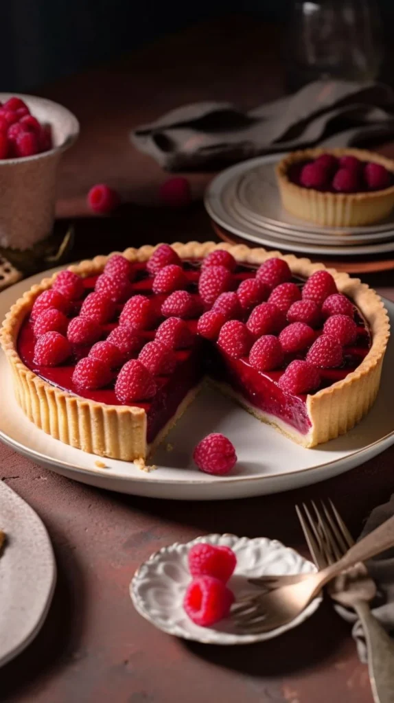 - Pour this layer over the tart and arrange halved raspberries on top.